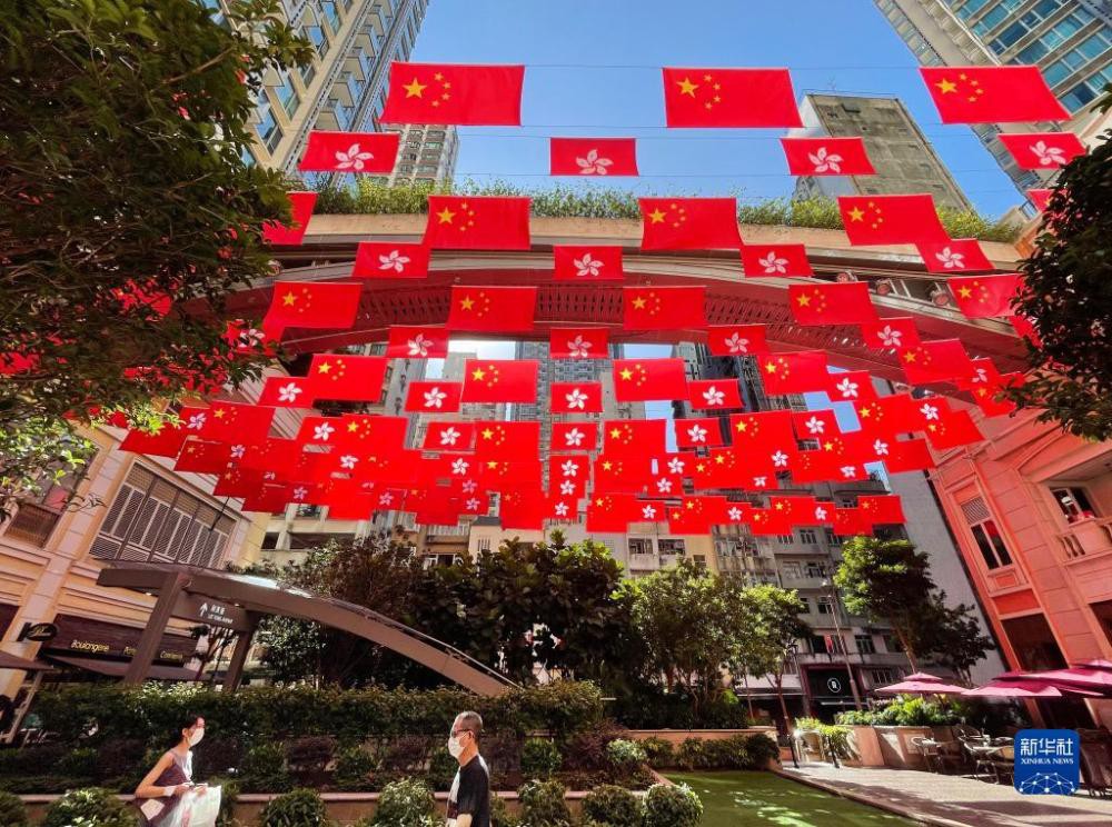 6月29日在香港街頭拍攝的五星紅旗和紫荊花區(qū)旗。香港回歸祖國25周年紀(jì)念日臨近,連日來,香港街頭洋溢著喜慶氛圍?! ⌒氯A社記者 盧炳輝 攝