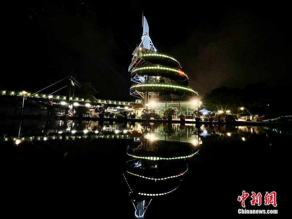 7月3日晚上,為慶祝香港回歸25周年,香港大埔區(qū)以大埔傳統(tǒng)文化及地區(qū)特色為主題,在大埔海濱公園回歸塔附近,舉行海、陸、空匯演,以200架無人機表演、25艘林村河彩燈船巡游及回歸塔燈飾共賀香港回歸祖國25周年。圖為大埔回歸塔亮起的燈飾。 中新社記者 李志華 攝