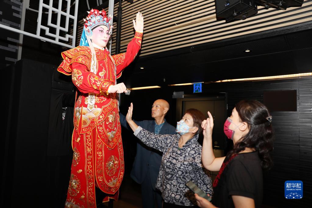 8月22日,創(chuàng)新粵劇《開心穿粵》的兩位導(dǎo)演羅家英(左)和鐘珍珍(中)向記者介紹機(jī)器人。新華社記者 吳曉初 攝