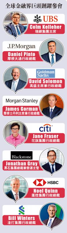 金管局昨日率先披露峰會(huì)日程及出席活動(dòng)的部分嘉賓名單,多家大型跨國金融機(jī)構(gòu)巨頭均答允出席,包括渣打集團(tuán)行政總裁Bill Winters、瑞銀集團(tuán)主席Colm Kelleher、高盛行政總裁David Solomon、摩通行政總裁Daniel Pinto、滙控集團(tuán)行政總裁Noel Quinn等。余偉文昨日透過網(wǎng)志撰文指,這項(xiàng)盛事匯聚100多家全球重要金融機(jī)構(gòu)主要負(fù)責(zé)人,當(dāng)中超30家機(jī)構(gòu)由集團(tuán)董事長或行政總裁代表,機(jī)構(gòu)類別涵蓋銀行、證券、資產(chǎn)管理、私募股權(quán)和風(fēng)險(xiǎn)投資、對(duì)沖基金和保險(xiǎn)等各個(gè)金融環(huán)節(jié)。他近日接受媒體訪問時(shí)透露,金管局于4至5個(gè)月前發(fā)出邀請(qǐng),已有環(huán)球金融領(lǐng)袖承諾出席,反應(yīng)良好。