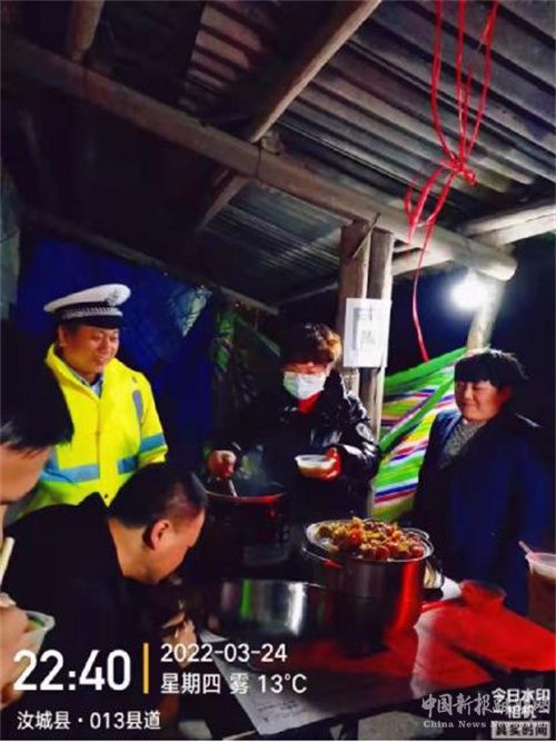 3月24日晚,工作人員如往常一樣在卡口值班值守,一輛紅色小車經(jīng)查驗(yàn)掃碼登記后正常通行經(jīng)過,令人意想不到的是,才一個(gè)多小時(shí)這輛車又返了回來,車上徑直下來三位女士,抬著電壓力鍋和冒著熱氣的蒸籠向值班點(diǎn)走來,原來是郵政銀行井坡支行行長羅婷和她的兩個(gè)同事,“我每日來往井坡上班,眼見工作人員風(fēng)雨不歇、非常辛苦,便萌生了做好吃的看望值班人員的想法,于是親自做了香菇豬肉餃子和瘦肉粥送過來。”