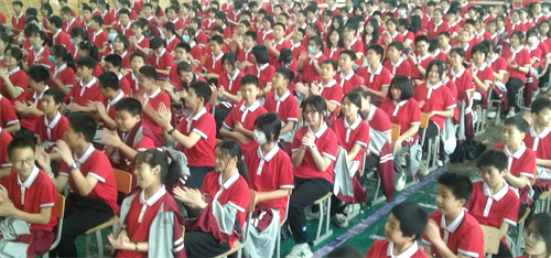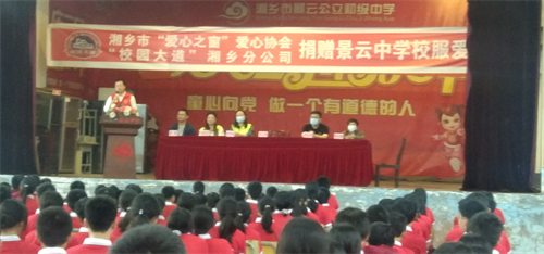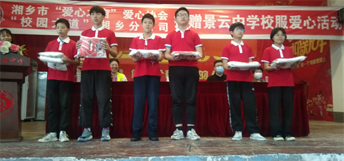 在捐贈儀式上,作為主辦方的福建“校園大道”湘鄉(xiāng)分公司負(fù)責(zé)人周青芳女士向景云中學(xué)的300名孩子每人捐贈一件紅色的短袖校服和50件籃球服。湘鄉(xiāng)市委宣傳部副部長賀文春作了熱情洋溢的講話,他以“強(qiáng)國有我”和“志愿服務(wù)有我”為主題,借用周青芳女士創(chuàng)業(yè)和湘鄉(xiāng)市“愛心之窗”愛心協(xié)會18年發(fā)展歷程的故事,勉勵獲得資助的學(xué)生能夠胸懷大志,努力學(xué)習(xí);在將來的生活和工作中能夠懷感恩之心,為建設(shè)社會主義現(xiàn)代化強(qiáng)國貢獻(xiàn)自己的一份力量,同時也能夠在以后的工作中多從事愛心志愿活動,把志愿精神傳遞下去。