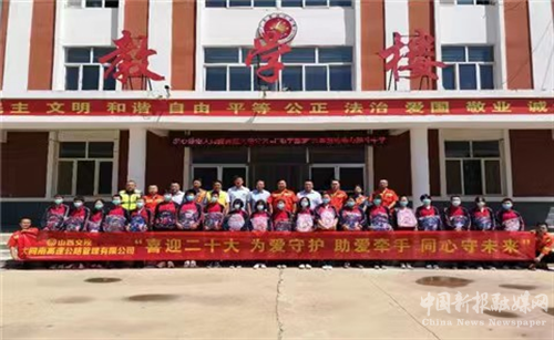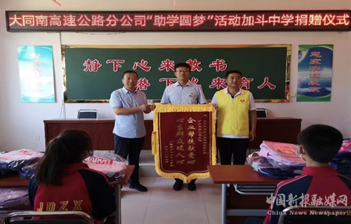 慰問老兵和困難群眾后,大家隨即來到廣靈縣加斗中學(xué) 開展“助學(xué)圓夢”活動加斗中學(xué)捐贈儀式。向貧困生捐贈書包 等學(xué)習(xí)用品,并鼓勵孩子們要發(fā)奮讀書,積極進取,將來用所學(xué)知識回報社會,為祖國和家鄉(xiāng)做貢獻。儀式結(jié)束之余, 還向?qū)W生們宣講了交通安全知識,使廣大同學(xué)能夠增強交通 安全意識,為共建平安和諧校園做出貢獻。最后,校方帶領(lǐng)大家參觀教學(xué)樓內(nèi)的國防教育主題長廊,從學(xué)生階段培養(yǎng)國 防觀念對國防教育起到重要作用,依托國防教育建設(shè),助力鄉(xiāng)村發(fā)展提質(zhì)。為感謝大同南高速公路分公司和各收費站、 維護站黨支部等愛心單位對加斗中學(xué)的關(guān)心和幫助,加斗中學(xué)向愛心單位敬贈錦旗。