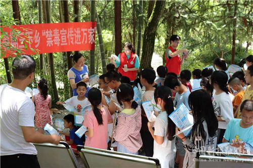活動(dòng)最后,綏寧縣禁毒協(xié)會(huì)秘書長(zhǎng)向志益和武陽(yáng)鎮(zhèn)黨委政府武裝政法委員肖波等工作人員和教育關(guān)愛(ài)服務(wù)團(tuán)的志愿者們、暑期支教夏令營(yíng)的同學(xué)們?cè)诨顒?dòng)現(xiàn)場(chǎng)“暑期三下鄉(xiāng)‘禁毒宣傳進(jìn)家’”橫幅前集體宣誓“珍愛(ài)生命,遠(yuǎn)離毒品”響徹山林。