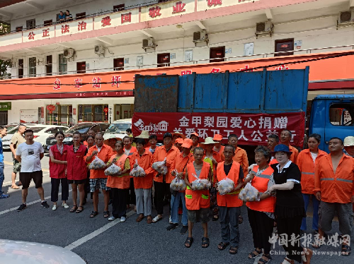 據(jù)悉,每年金甲梨園在梨子采摘后,都會開展以“夏天送清涼”關(guān)愛城市守護者行動為主題的公益行動,為環(huán)衛(wèi)工人送去高溫下的一抹清涼。