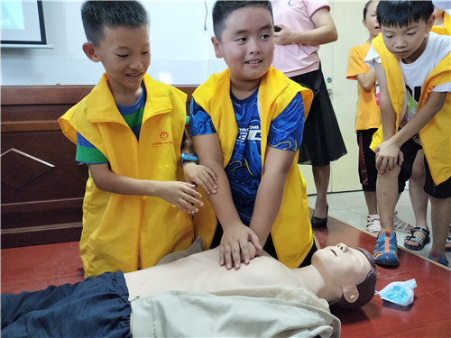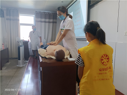 活動(dòng)現(xiàn)場(chǎng),果園鎮(zhèn)衛(wèi)生院骨干醫(yī)師周醫(yī)師為大家詳細(xì)講解了徒手心肺復(fù)蘇的知識(shí)(包含防溺水的心肺復(fù)蘇知識(shí)等)。緊接著,果園鎮(zhèn)衛(wèi)生院住院部主任龍醫(yī)生結(jié)合理論知識(shí)和實(shí)際救護(hù)技巧,為大家講解了海姆力克急救法的救護(hù)知識(shí),龍醫(yī)生為了使學(xué)生更深入了解各項(xiàng)救護(hù)技巧,掌握心肺復(fù)蘇要領(lǐng),與孩子們?cè)诂F(xiàn)場(chǎng)展開(kāi)了深入互動(dòng),對(duì)心肺復(fù)蘇進(jìn)行了實(shí)操演練,手把手向同學(xué)們傳授了急救手法,詳細(xì)地講解了急救注意事項(xiàng),進(jìn)一步給大家講解了心肺復(fù)蘇“一看、二判、三掃視、四呼、五定、六壓胸、七開(kāi)、八吹、九檢查”等相關(guān)操作要領(lǐng)?,F(xiàn)場(chǎng)孩子們學(xué)習(xí)非常認(rèn)真,雖然天氣很熱,但報(bào)名參加實(shí)操的孩子們個(gè)個(gè)激情高漲,積極舉手報(bào)名參與。