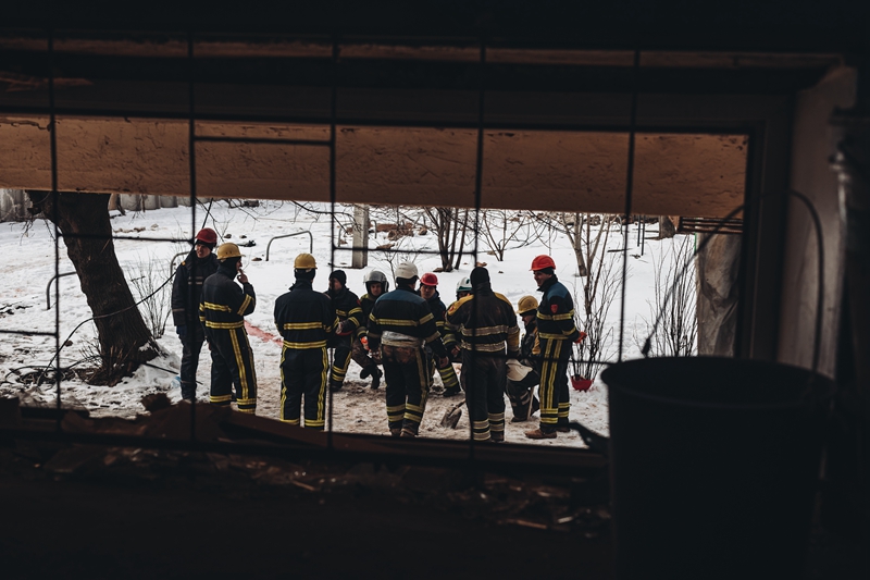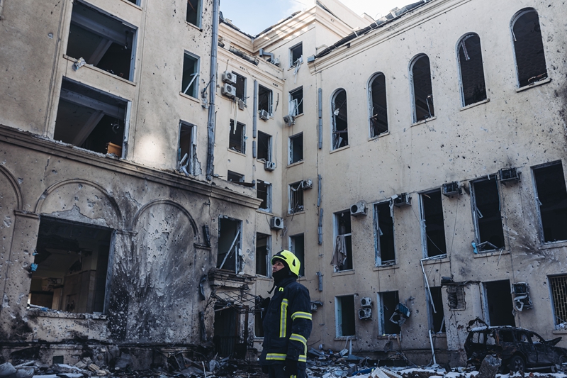 ↑3月13日,在烏克蘭哈爾科夫,消防員在建筑附近工作。新華社發(fā)(迭戈·埃雷拉攝)