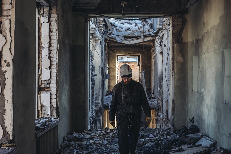 ↑3月13日,在烏克蘭哈爾科夫,消防員在一處建筑內(nèi)工作。新華社發(fā)(迭戈·埃雷拉攝)
