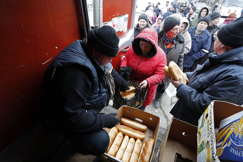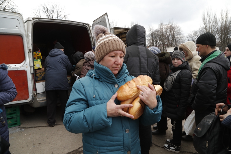 ↑3月15日,一名當(dāng)?shù)嘏釉陬D涅茨克的沃爾諾瓦哈領(lǐng)取面包。新華社發(fā)(維克托攝)