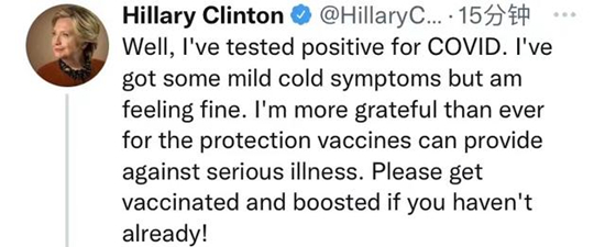 綜合美聯(lián)社、美國有線電視新聞網(wǎng)(CNN)等報(bào)道,美國前國務(wù)卿希拉里·克林頓新冠病毒檢測結(jié)果呈陽性。報(bào)道稱,希拉里22日發(fā)布推特稱,自己已感染新冠,她在推文中寫道:“我的新冠病毒檢測呈陽性。我有一些輕微的感冒癥狀,但感覺良好。我比以往任何時(shí)候都更加感謝疫苗可以提供針對(duì)嚴(yán)重疾病的保護(hù)。如果你還沒接種,請接種并加強(qiáng)!”