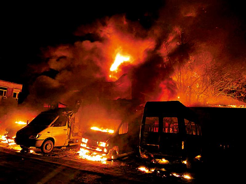 圖:烏克蘭南部重鎮(zhèn)尼古拉耶夫23日遭炮彈襲擊,有汽車和建筑物起火。\路透社