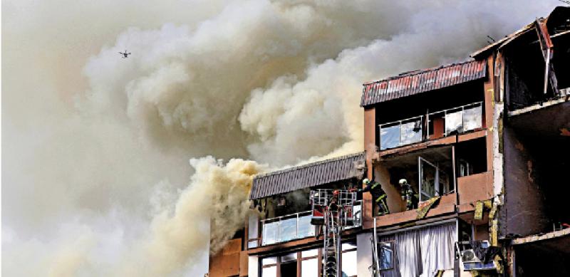 烏克蘭當局表示,基輔及所屬的基輔州26日被14枚導(dǎo)彈轟炸,其中一幢九層高的居民樓及一間幼稚園被擊中。被擊中的居民樓損毀嚴重,頂部三層全被燒毀。烏方稱從居民樓中救出一名7歲女孩,她的父親在襲擊中身亡。