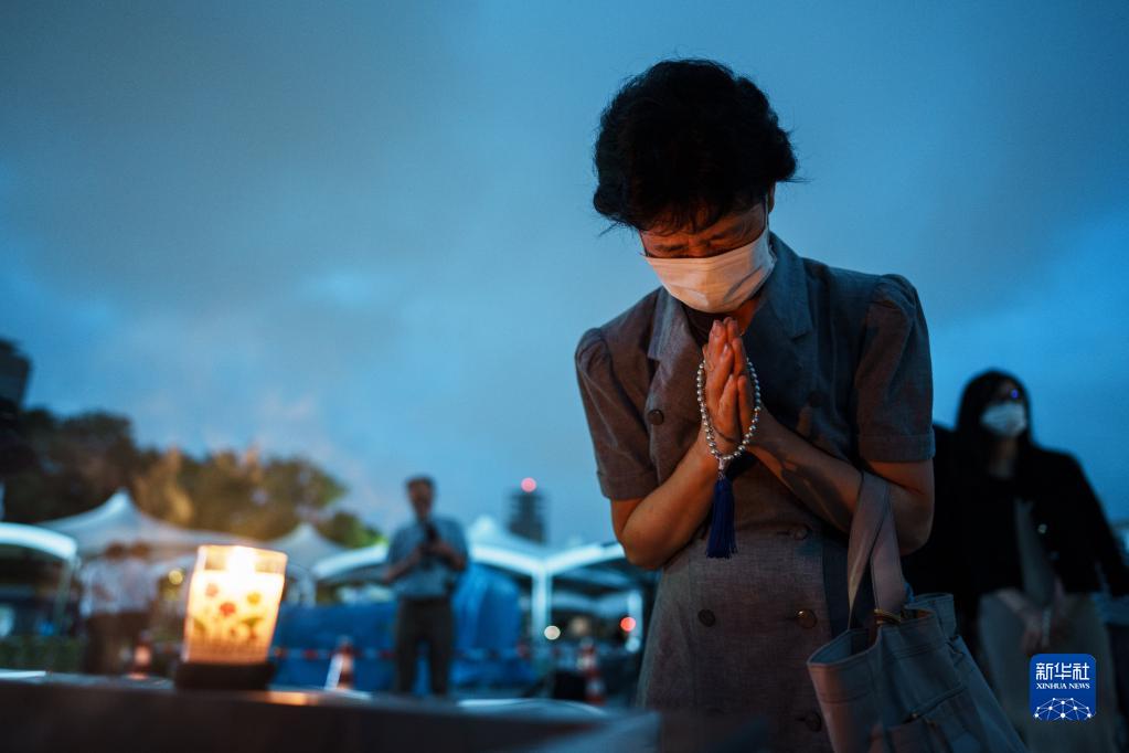 8月6日,一名女子在日本廣島和平紀(jì)念公園的和平都市紀(jì)念碑前祈禱。