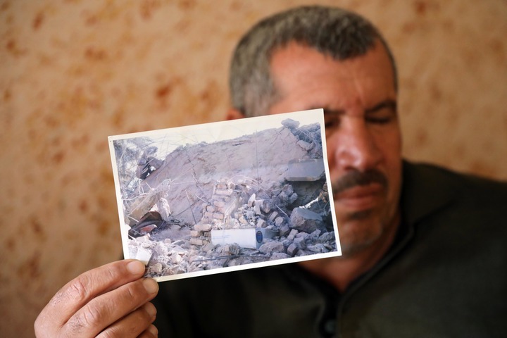 1月4日,在伊拉克薩拉赫丁省,易卜拉欣展示自家房屋炸毀的照片。2005年12月,美軍發(fā)射的導(dǎo)彈擊中了易卜拉欣的家,包括他的妻子和年僅12歲的女兒在內(nèi)的3名平民死亡,12人受傷。易卜拉欣本人終身癱瘓。新華社發(fā)