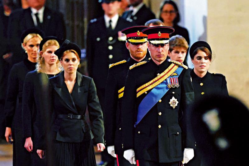 圖:女王的孫輩17日在威斯敏斯特禮堂為她守靈。\美聯(lián)社