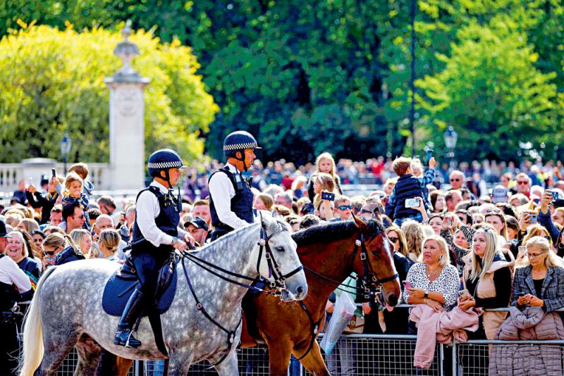 圖:英國女王國葬即將舉行,警察18日在白金漢宮附近騎馬巡邏。\法新社