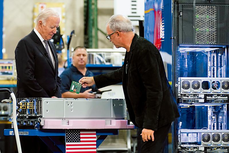 圖:美國總統(tǒng)拜登(左)6日視察紐約一間芯片廠。\美聯(lián)社