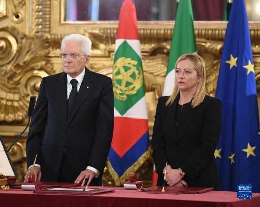 10月22日,在意大利羅馬,意大利總統(tǒng)馬塔雷拉(左)和新任總理焦?fàn)柤獘I·梅洛尼出席宣誓就職儀式。新華社記者 金馬夢(mèng)妮 攝