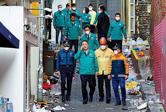 圖:尹錫悅(前排左二)10月30日視察事故現(xiàn)場。/美聯(lián)社