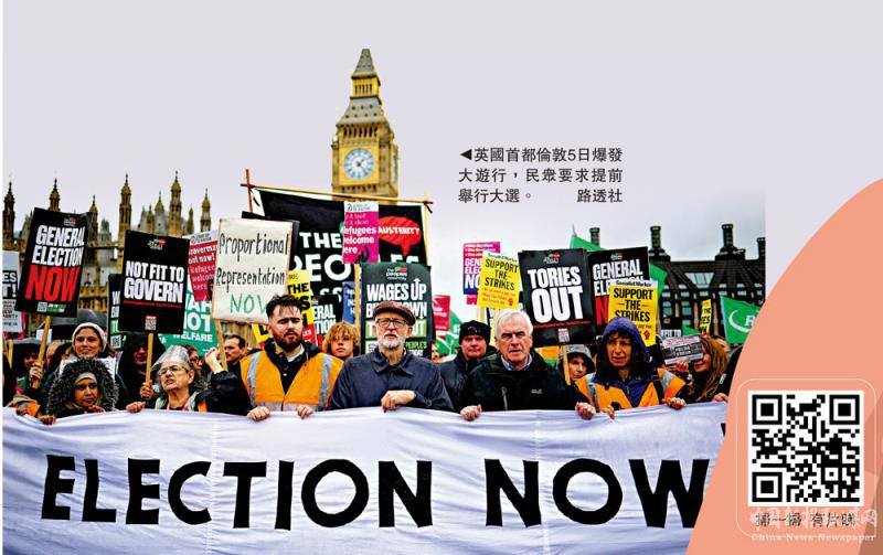 圖:英國首都倫敦5日爆發(fā)大游行,民眾要求提前舉行大選。\路透社