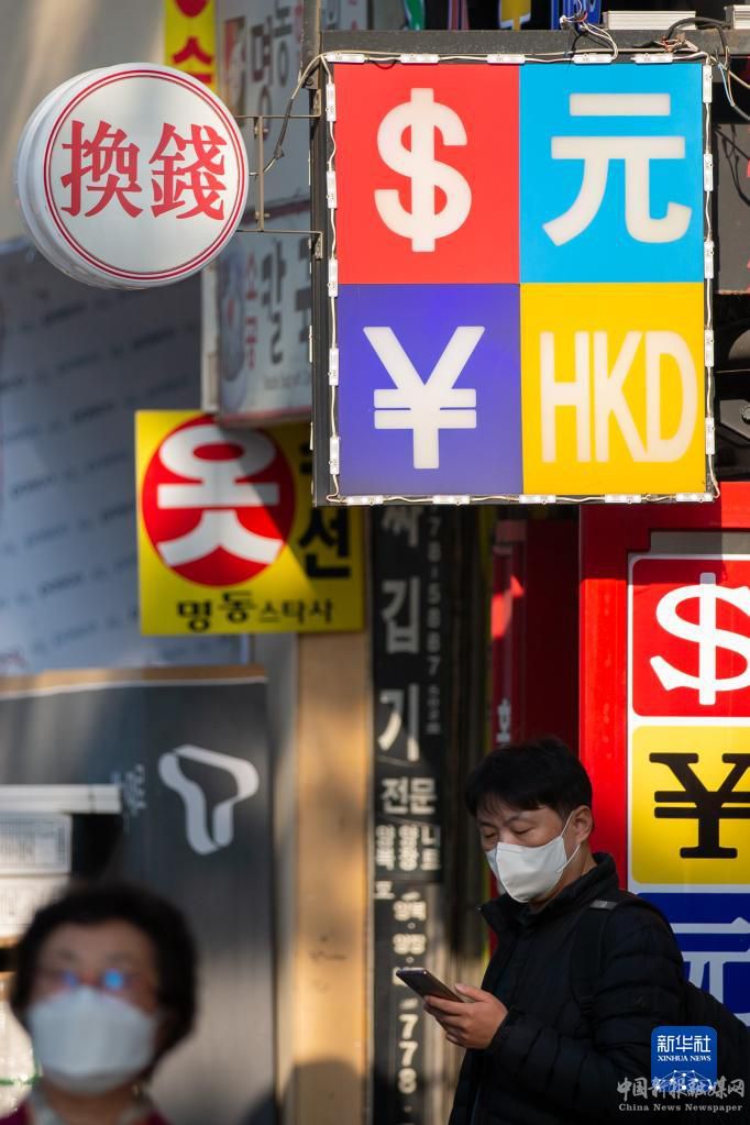 11月24日,行人經(jīng)過韓國首爾明洞街區(qū)開設(shè)的一些換錢所。新華社記者 王益亮 攝