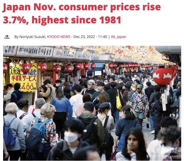 日本共同社:日本總務(wù)省最新公布的11月核心通脹率同比上漲3.7%,創(chuàng)下41年來新高,也是連續(xù)7個月超過日本央行2%的通脹目標(biāo)。