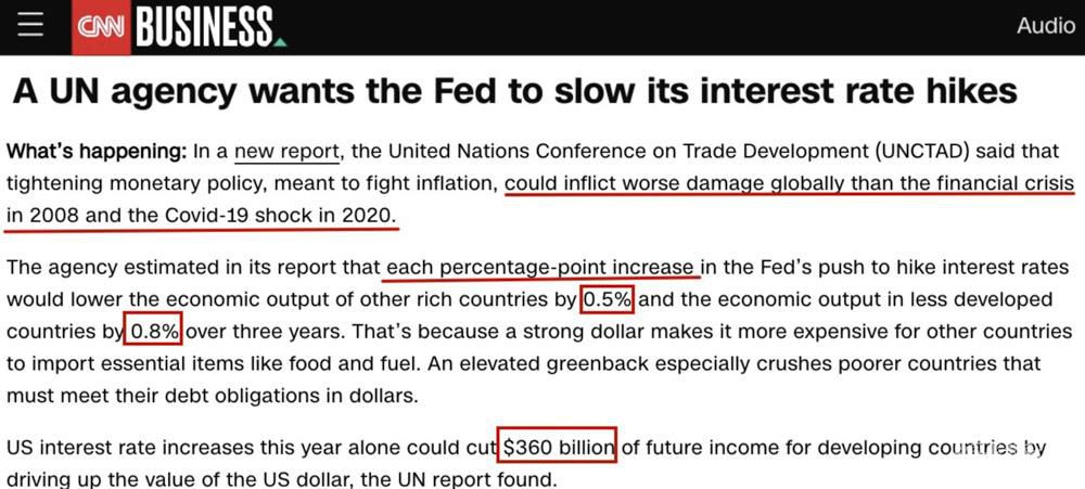聯(lián)合國貿(mào)發(fā)會議在一份報(bào)告中警告,對抗通脹的貨幣緊縮政策可能會在全球范圍內(nèi)造成“比2008年金融危機(jī)和新冠疫情沖擊更嚴(yán)重的損害”。據(jù)估計(jì),美聯(lián)儲每加息1個百分點(diǎn),三年內(nèi)其他發(fā)達(dá)國家的經(jīng)濟(jì)產(chǎn)出就會降低0.5%,發(fā)展中國家的經(jīng)濟(jì)產(chǎn)出將降低0.8%。