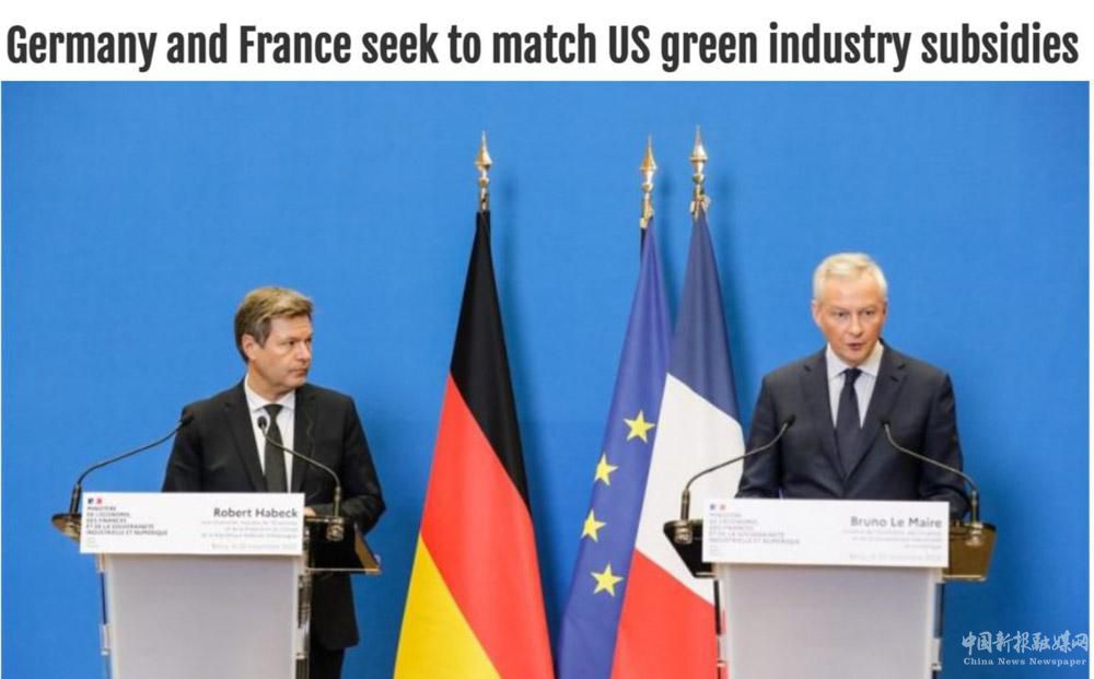 歐洲動態(tài)網(wǎng):當(dāng)?shù)貢r間12月19日,法國經(jīng)濟(jì)和財(cái)政部長勒梅爾(右)與德國經(jīng)濟(jì)和氣候保護(hù)部長哈貝克(左)發(fā)表聯(lián)合聲明稱,法德兩國將更“積極地”回應(yīng)美國的《通脹削減法案》;此外兩國還將著手采取新的措施,支持歐盟的綠色產(chǎn)業(yè)發(fā)展。
