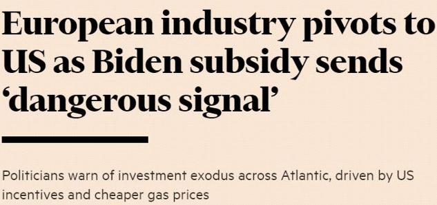 英國《金融時報(bào)》:美國低廉的能源價格和《通脹削減法案》中的補(bǔ)貼政策吸引歐洲企業(yè)將生產(chǎn)線轉(zhuǎn)移至美國