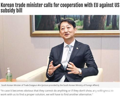 歐洲動態(tài)網(wǎng):韓國產(chǎn)業(yè)通商資源部通商交涉本部長安德根近日接受該媒體采訪時表示,歐盟和韓國應(yīng)該合作應(yīng)對美國的《通脹削減法案》, “如果他們(美國)什么都做不了,或者沒有表現(xiàn)出任何愿意與我們合作尋找適當(dāng)解決方案的意愿,我們將不得不尋求另一種選擇”。