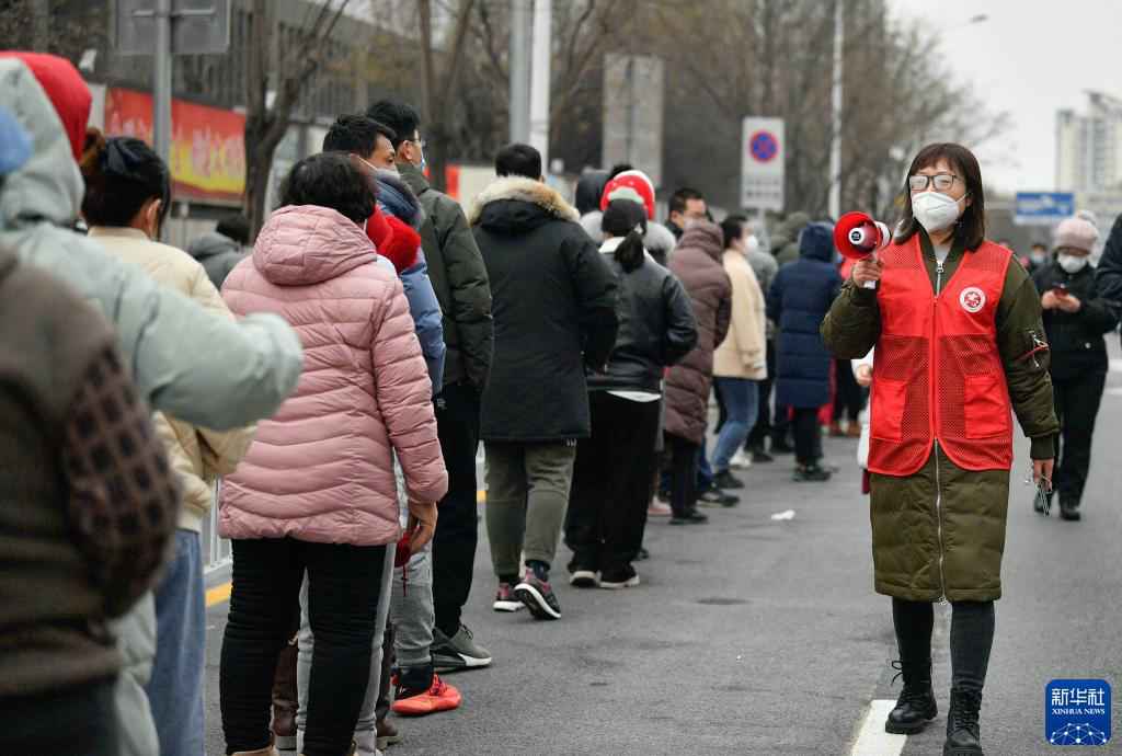 1月9日,在天津市南開區(qū)鼓樓街道一處核酸檢測點(diǎn),志愿者(右)用廣播喇叭提示市民核酸檢測注意事項(xiàng)。新華社記者 孫凡越 攝