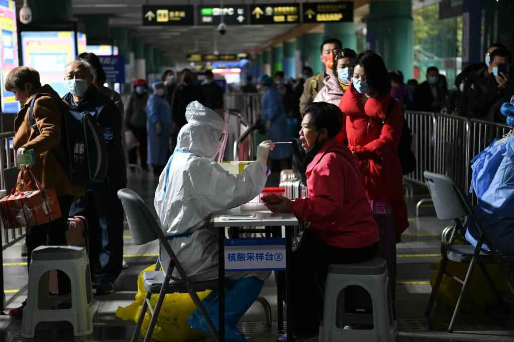 1月10日,在深圳火車站,抵深旅客進(jìn)行核酸檢測。(新華社記者梁旭 攝)