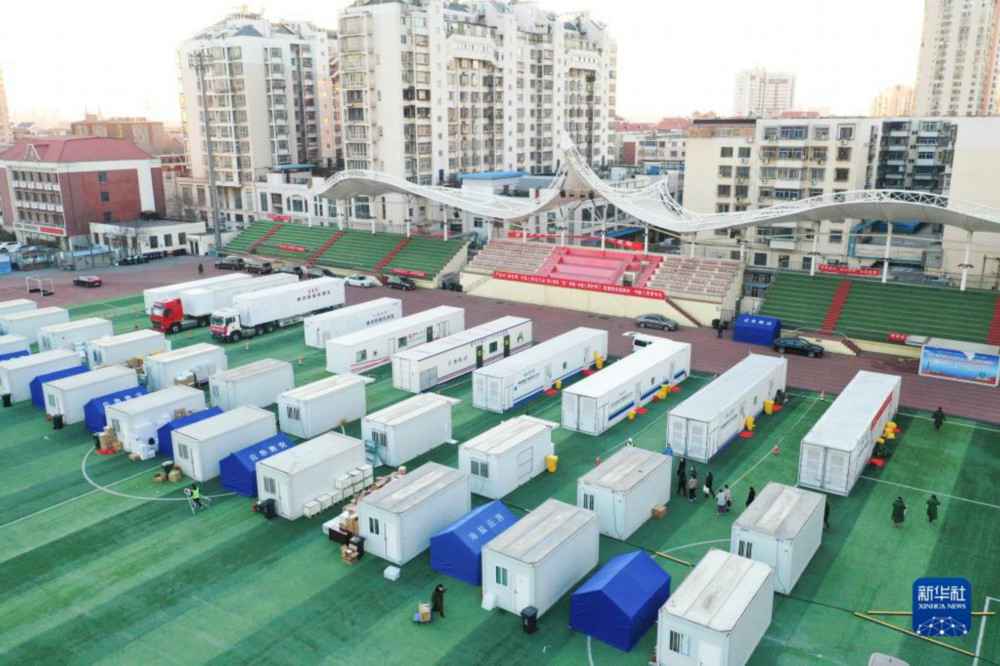 這是1月12日拍攝的位于天津市濱海新區(qū)塘沽體育場內(nèi)的方艙實驗室(無人機照片)。