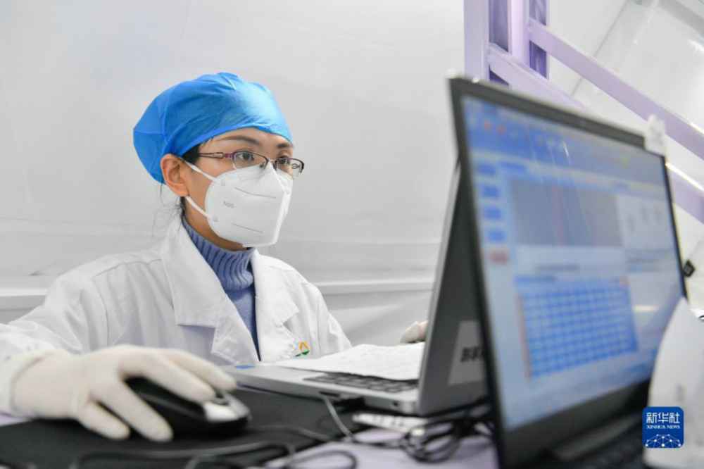 1月13日,在天津市北辰區(qū)某高校,氣膜實驗室工作人員在擴增分析區(qū)分析核酸樣本數(shù)據(jù)。