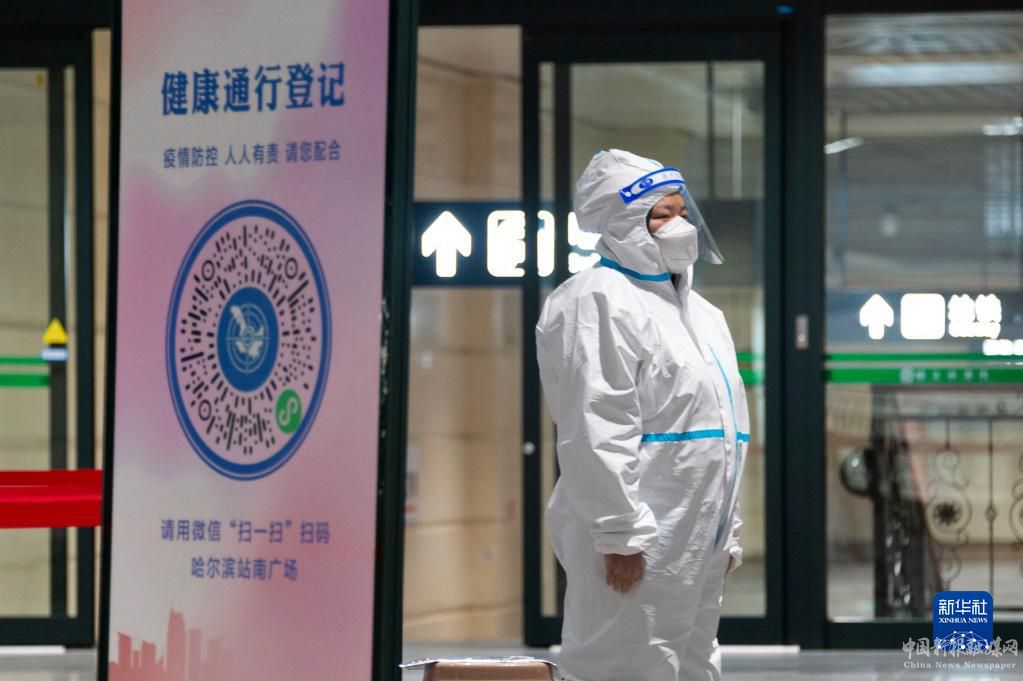 3月21日,工作人員在哈爾濱站南廣場進站口值守。