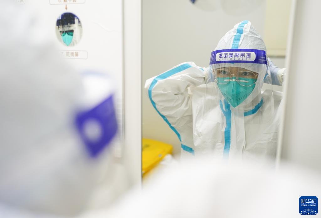 3月23日凌晨,核酸檢測(cè)實(shí)驗(yàn)室的工作人員呂文航在穿戴防護(hù)面罩。