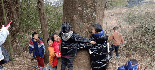 隨后,活動組來到塞海村千金排,參觀這里的古樹木群。這里地勢高竣,人煙稀少,卻保存著樹齡全都超100年、最老的達300多年的皂莢樹、楊梅樹、女貞樹和柏樹等古老樹木。孩子們興奮地圍觀著,用眼看一看,用耳聽一聽,用鼻聞一聞,用嘴嘗一嘗,最后,忍不住幾個人用手合抱,測測它的大小。通過這一系列的動作,讓孩子們直觀感受到了《古樹的心跳》。