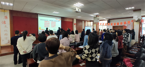 第二階段:3月10日下午,召開全校教職工大會傳達(dá)落實。會議由校黨總支副書記、校長鄧立云主持。校紀(jì)檢員王芳意組織學(xué)習(xí)“2022年全市教育系統(tǒng)全面從嚴(yán)治黨暨清廉學(xué)校建設(shè)工作會議”精神。鄧永紅書記從建設(shè)清廉學(xué)校的重要性、必要性進行了解讀,并就下一步學(xué)校的建設(shè)工作做初步安排。隨后在領(lǐng)導(dǎo)班子的帶領(lǐng)下,廣大教職工進行了莊嚴(yán)的宣誓,鏗鏘誓言表達(dá)了“創(chuàng)建清廉學(xué)校”的決心。最后,鄧立云校長布置近期重點工作,對校園疫情防控、安全管理等方面做出了嚴(yán)格要求。