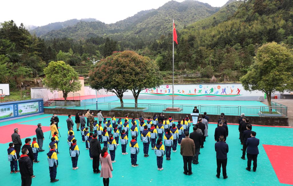 3月28日,大源鎮(zhèn)橋頭小學(xué)的師生參加新校園首個升旗儀式。新華社記者 王瑞平 攝