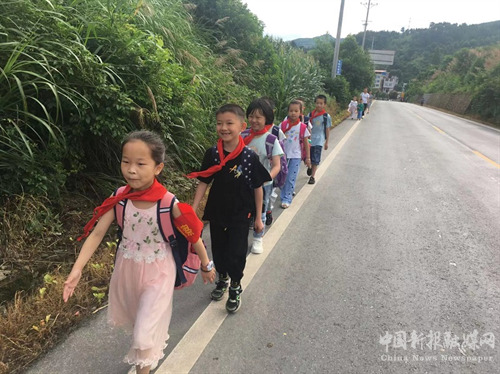“人員已經(jīng)到齊,大家一定要遵守隊規(guī),嚴禁任何人中途離隊。”6月21日下午四點半,新寧縣黃金瑤族鄉(xiāng)中心小學黃金村至桃林村線的學生路長舒愛萍清點隊員后,重溫路隊紀律,一齊往家走去。