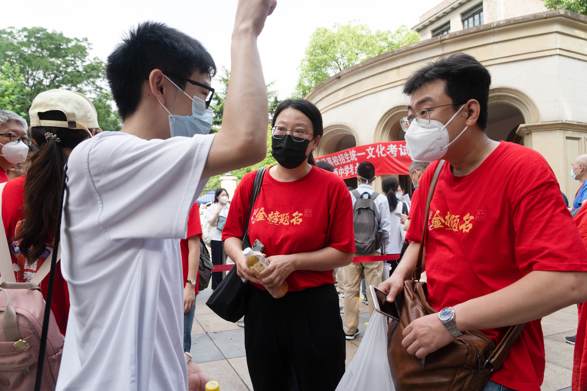 7月7日,上海市靜安區(qū)市西中學(xué)高考考點(diǎn),老師身穿寫有“金榜題名”的紅色衫送考。(中國日報(bào)記者 高爾強(qiáng) 攝)