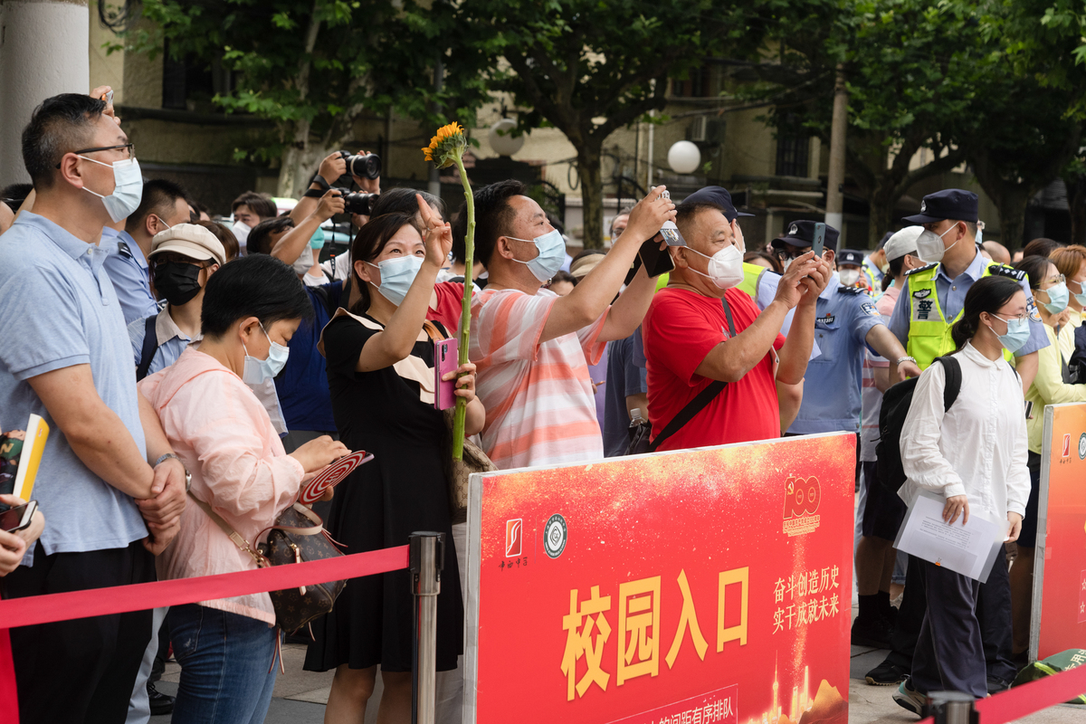 7月7日,上海市靜安區(qū)市西中學(xué)高考考點(diǎn),家長在考場外等候。(中國日報(bào)記者 高爾強(qiáng) 攝)
