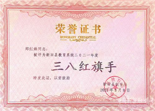 鄭紅娟老師獲“三八紅旗手”榮譽證書