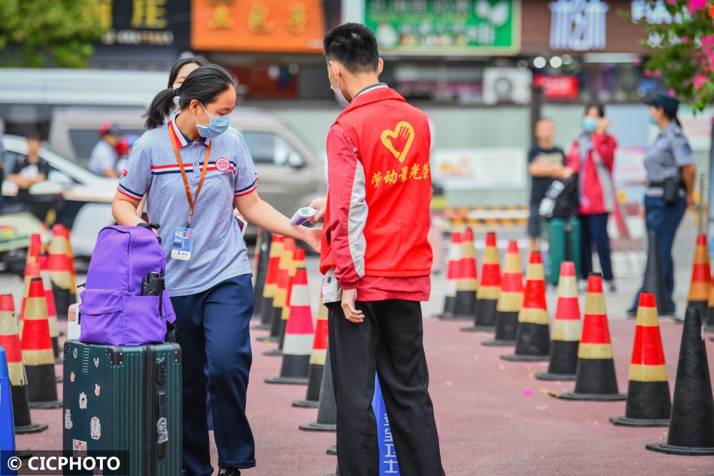 ↑2022年8月31日,重慶市綦江區(qū)南州中學(xué)的學(xué)生有序入校進(jìn)行體溫檢測。CICPHOTO/陳星宇 攝