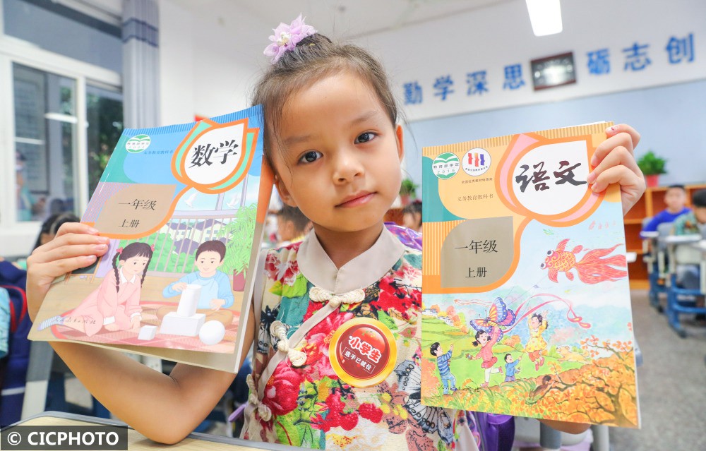 ↑2022年8月31日,浙江省湖州市德清縣實(shí)驗(yàn)學(xué)校,一年級新生在展示領(lǐng)取的新教材。CICPHOTO/王樹成 攝