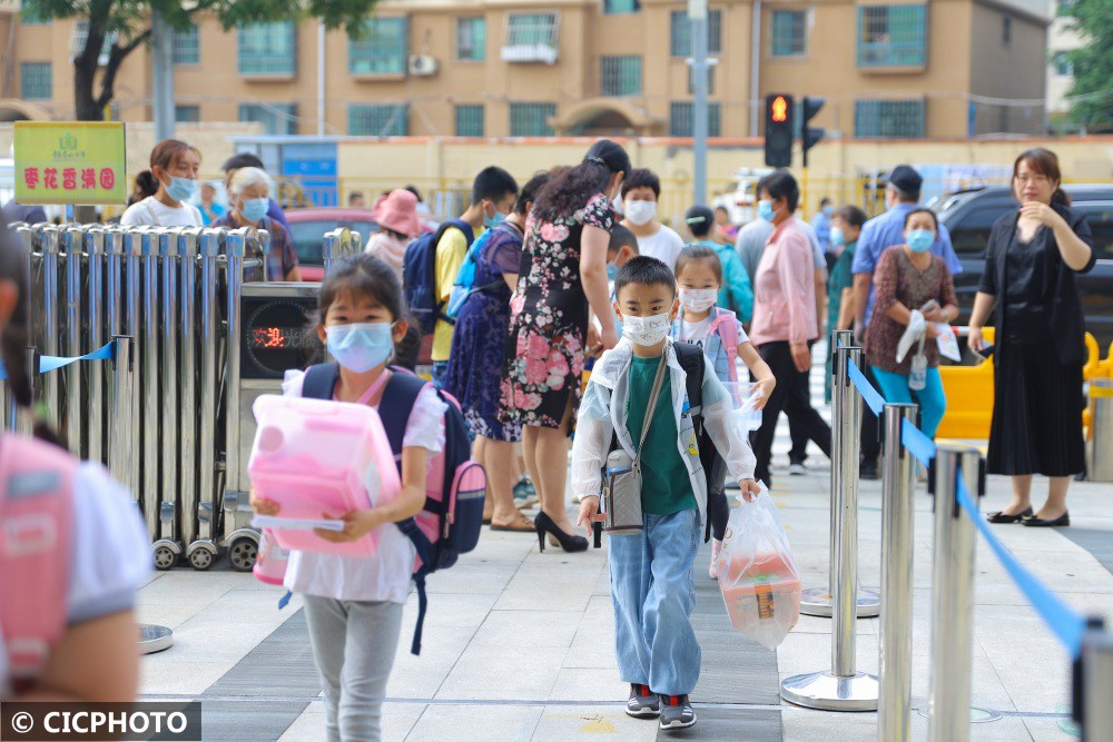 ↑2022年8月31日,山東省青島市李滄區(qū)棗山路小學(xué)的學(xué)生們有序入學(xué)報(bào)到。CICPHOTO/張鷹 攝