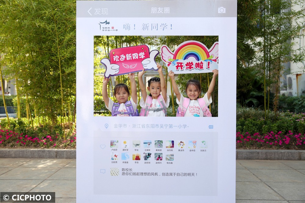 ↑2022年8月30日,浙江省東陽市吳寧第一小學(xué)的學(xué)生在“歡迎新同學(xué)”的展板旁合影留念。CICPHOTO/胡揚(yáng)輝 攝