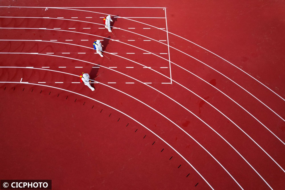 ↑2022年8月28日,四川省內(nèi)江市東興區(qū)牛牦山小學(xué)的防疫工作人員在校園內(nèi)進(jìn)行消殺作業(yè)。(無人機(jī)照片)。CICPHOTO/蘭自濤 攝