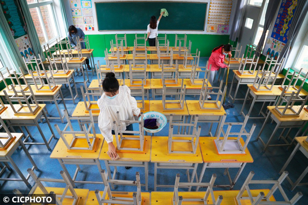 ↑2022年8月28日,河北省邢臺市內(nèi)丘縣實(shí)驗(yàn)小學(xué)的教師在教室里打掃衛(wèi)生。CICPHOTO/劉繼東 攝
