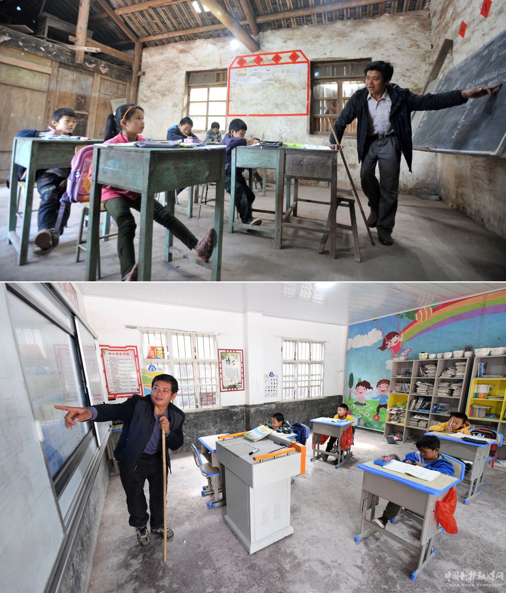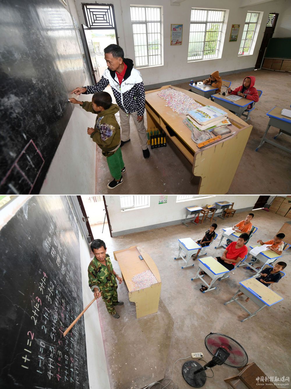 上圖:在廣西靈川縣海洋鄉(xiāng)小平樂中心岐教學(xué)點(diǎn),秦興國老師在給學(xué)生上課(2013年3月27日攝)。下圖:在廣西靈川縣海洋鄉(xiāng)安泰教學(xué)點(diǎn),秦興國老師在給學(xué)生上課(2021年10月28日攝)。